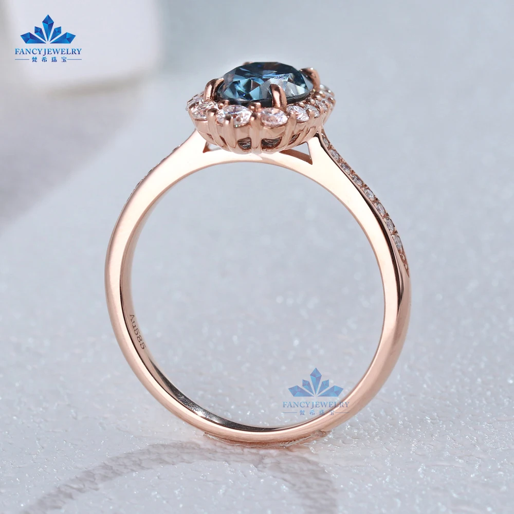 14k Rose Gold Vintage Engagement Ring Design Oval 1.5ct Blue Grey Moissanite Melee Diamond halo Engagement Wedding Ring