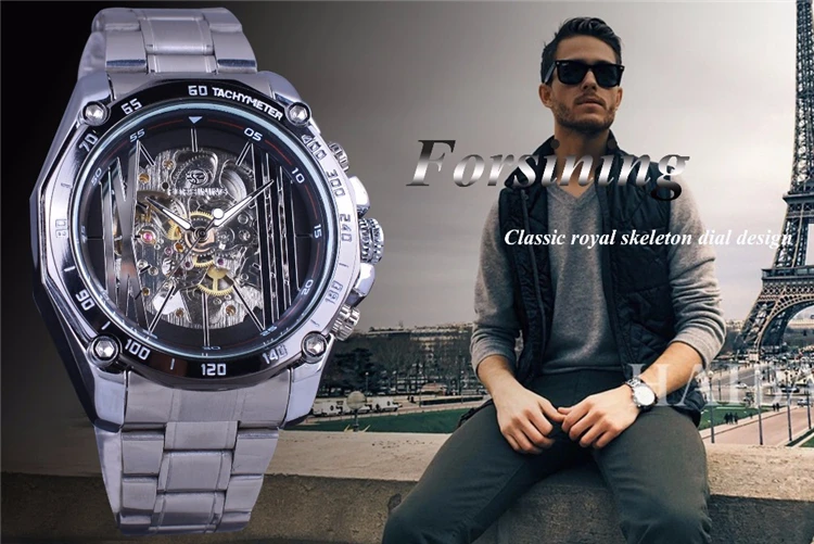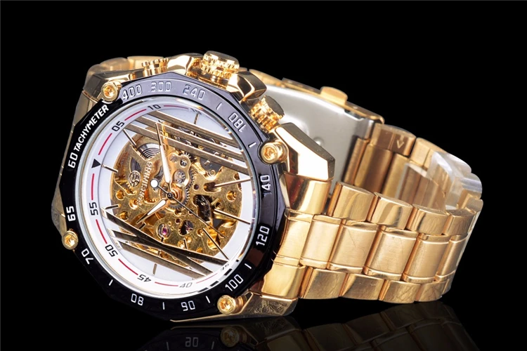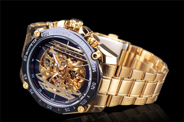 Forsining Golden Stainless Steel Band Top Brand Luxury Mechanical Wristwatches Fashion Openwork Men's Watch Skeleton Male Clock