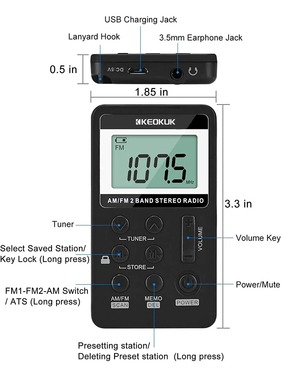 Defaults to stereo sound, with mute button(short press the power switch), you can set/delete radio station presets.