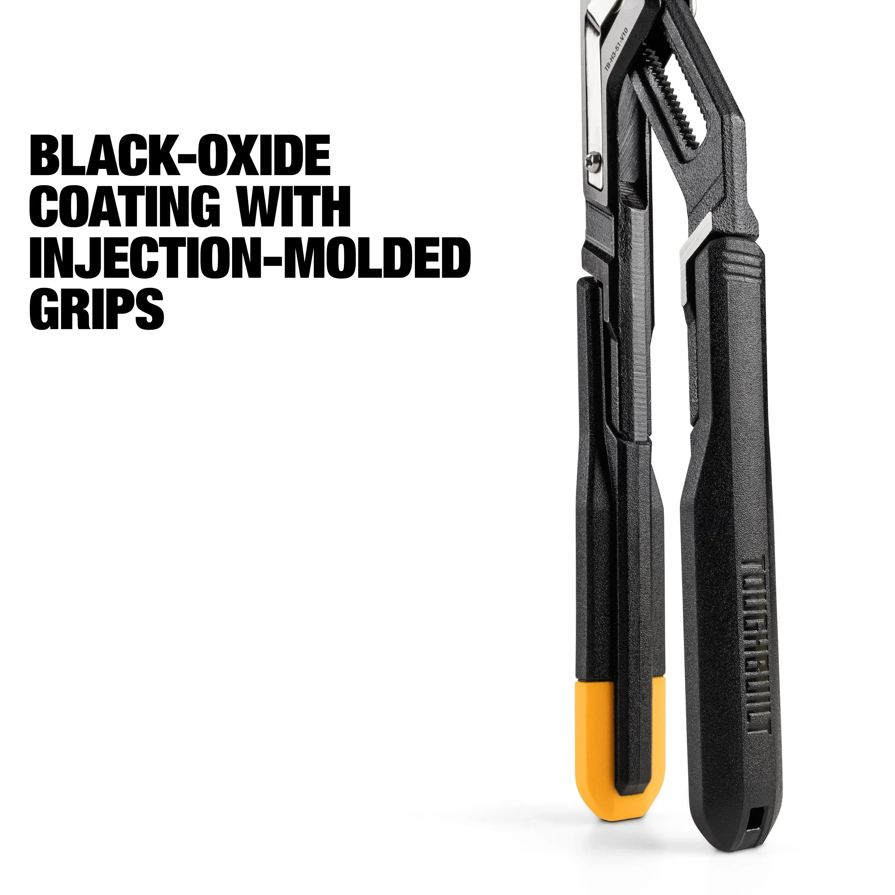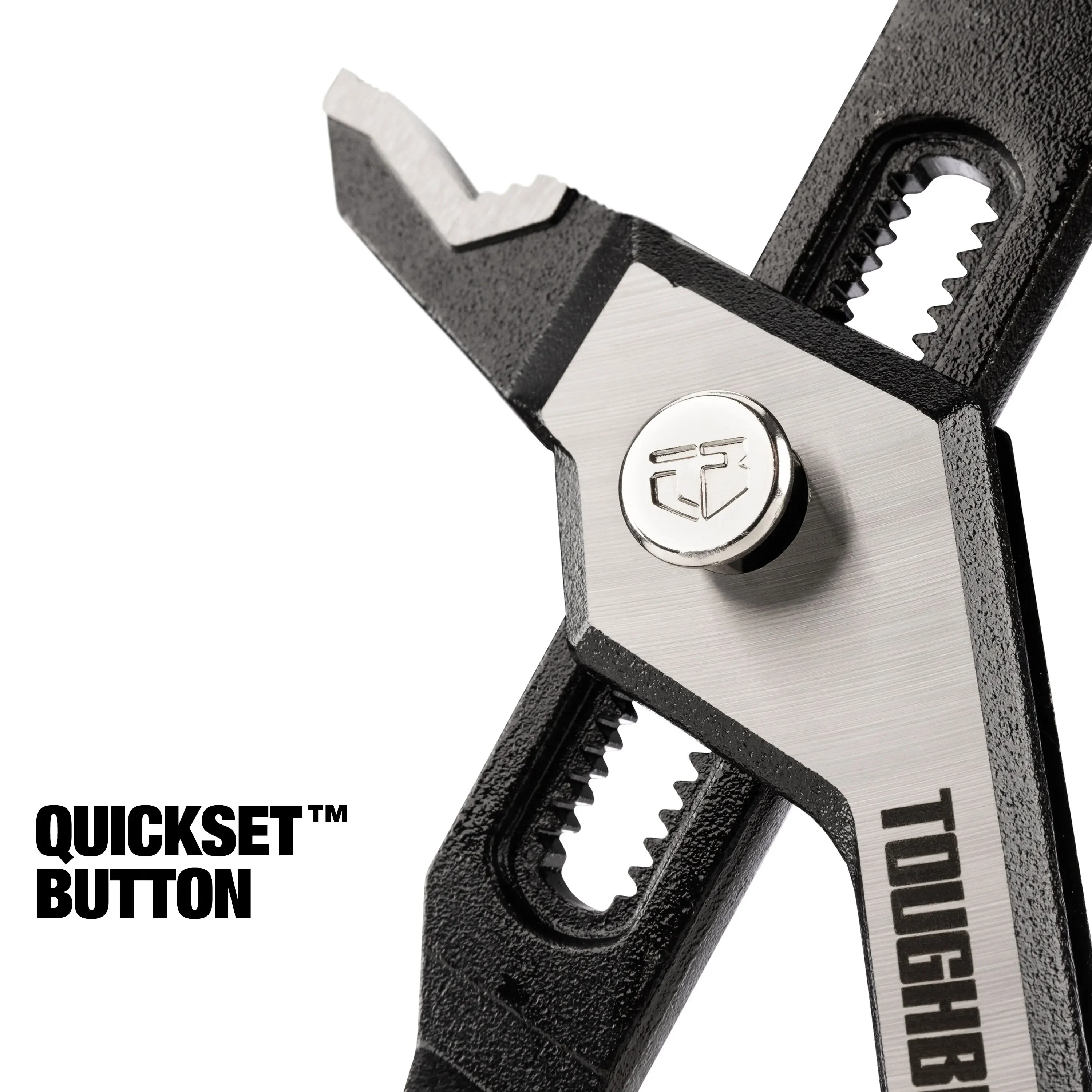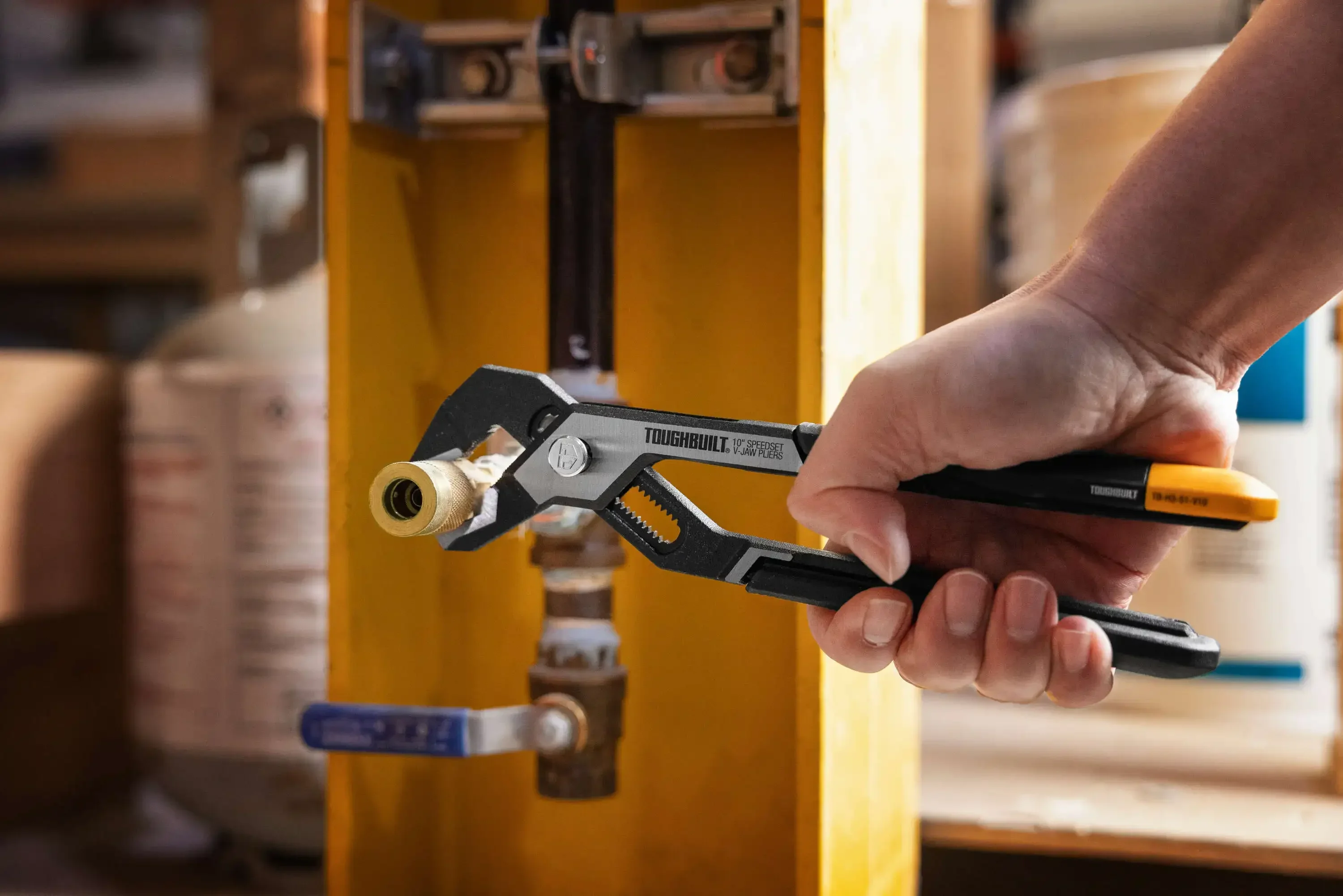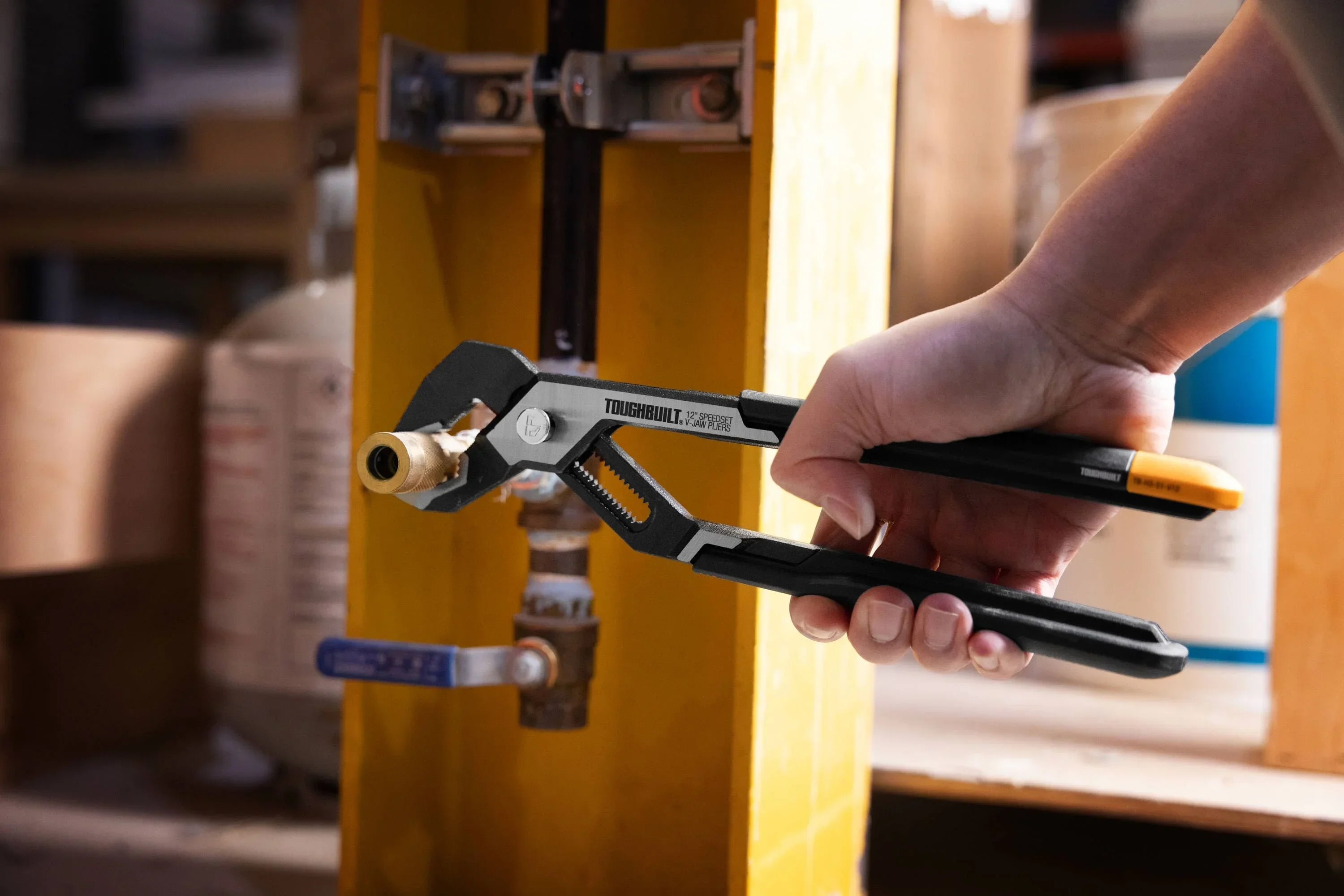 The ToughBuilt 12" SpeedSet V-jaw pliers quickly adjust on the workpiece which makes it easier to work in confined spaces. SpeedSet push button allows the lower jaw to slide smoothly and widen up to 2-1/8". The 22 micro-adjustments ensure the pliers can firmly grip fasteners and pipes of different sizes. Wide ergonomic grips are designed for all-day comfort when maximum force is being applied. To adjust the pliers opening, press the button, place the jaws around the workpiece, and slide the lower jaw closed.