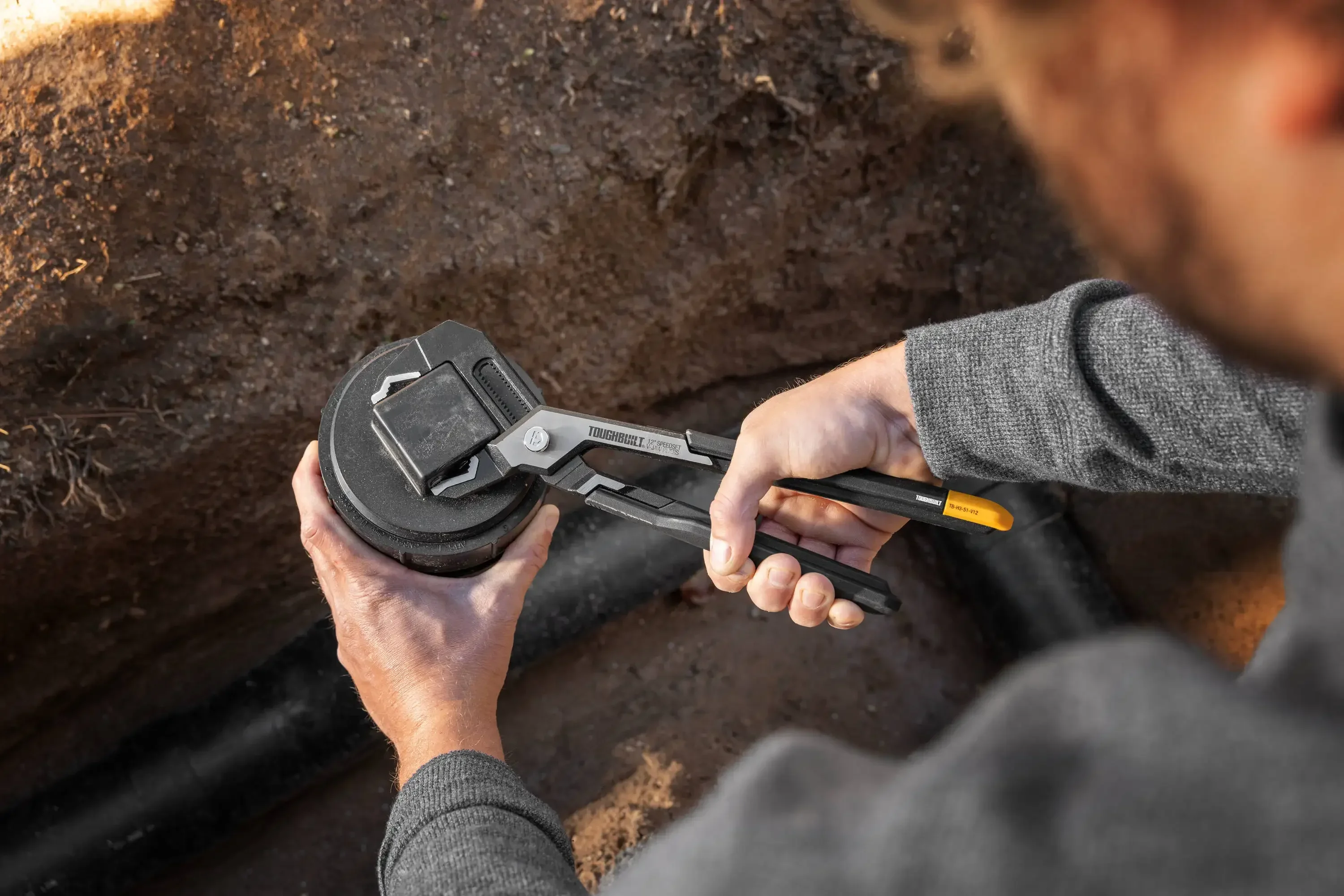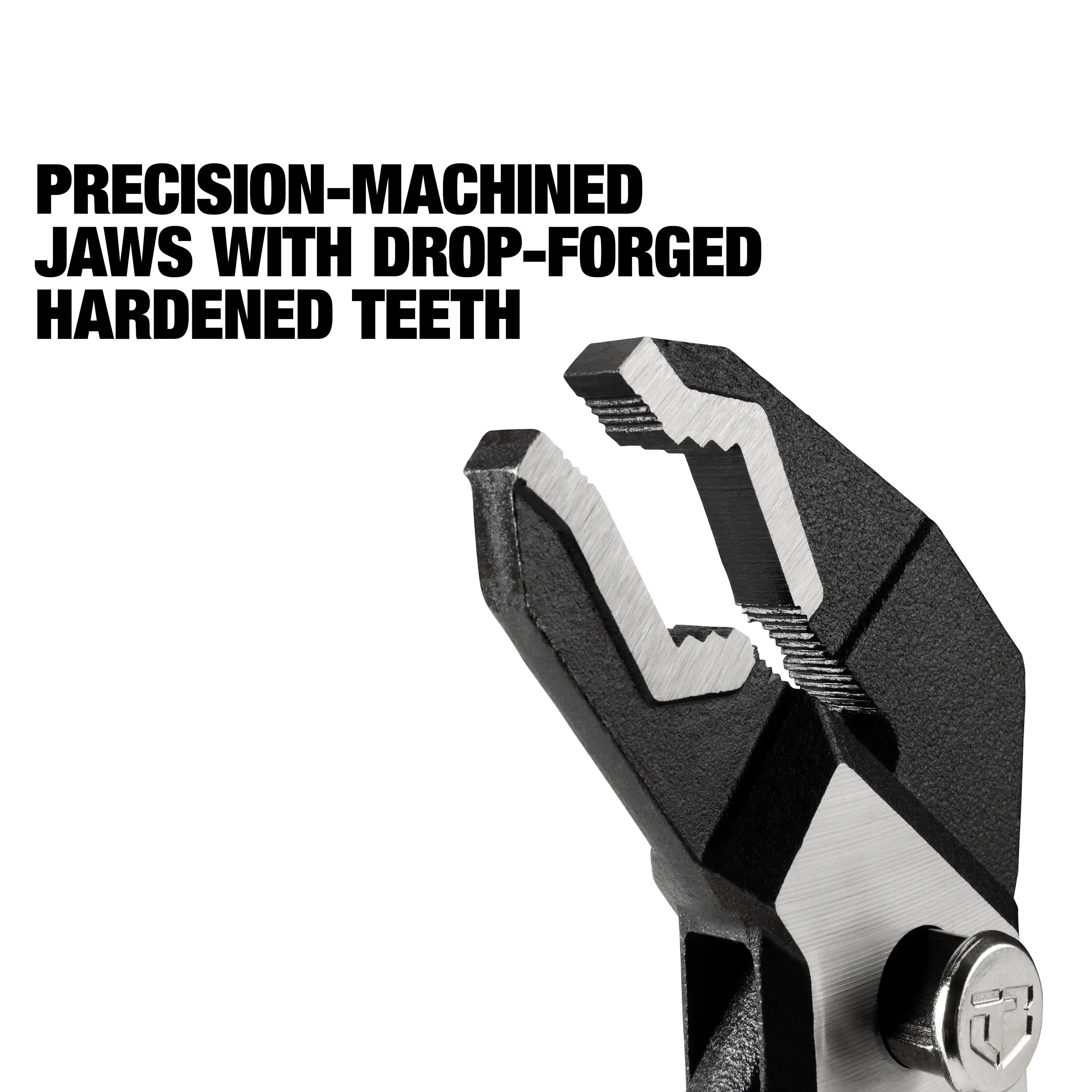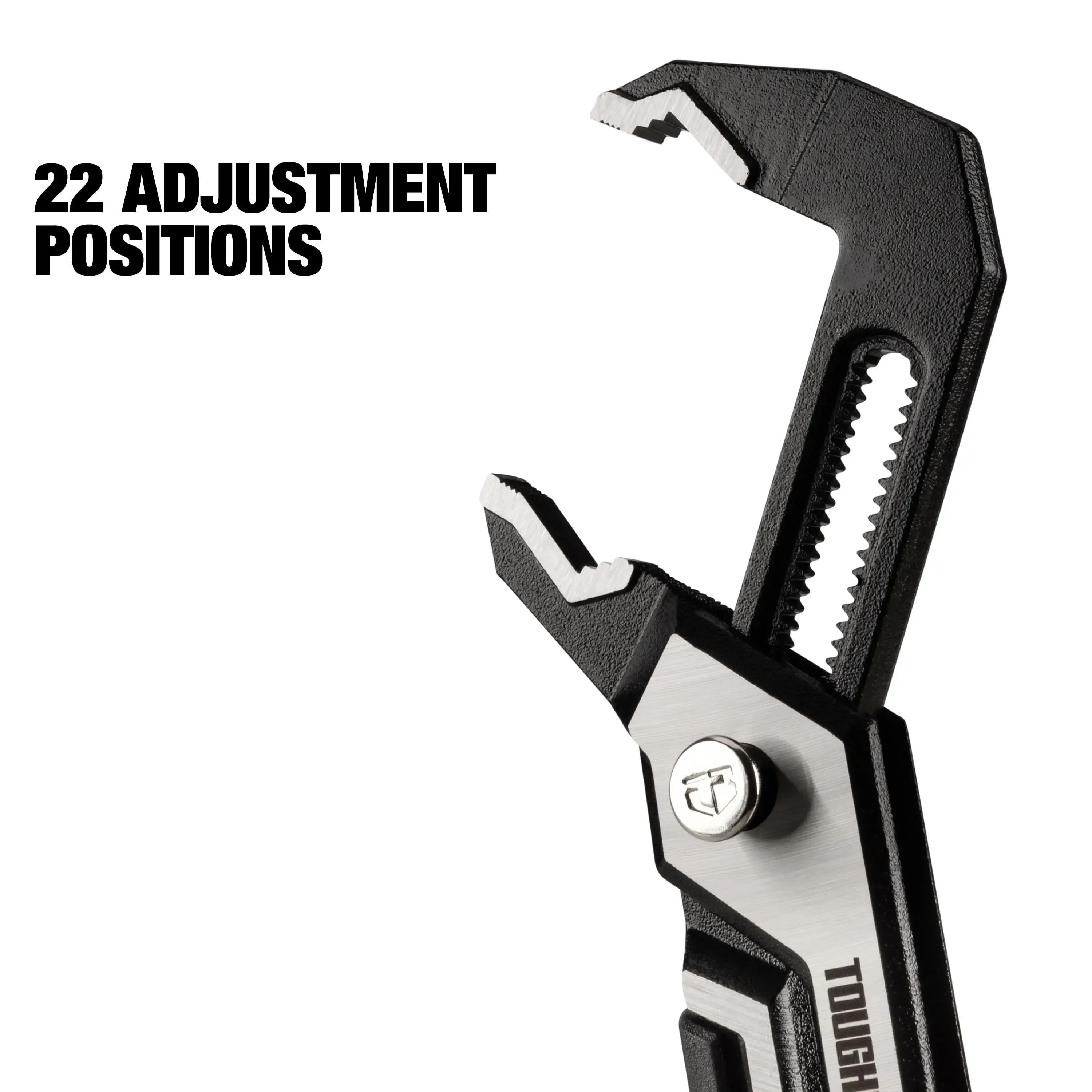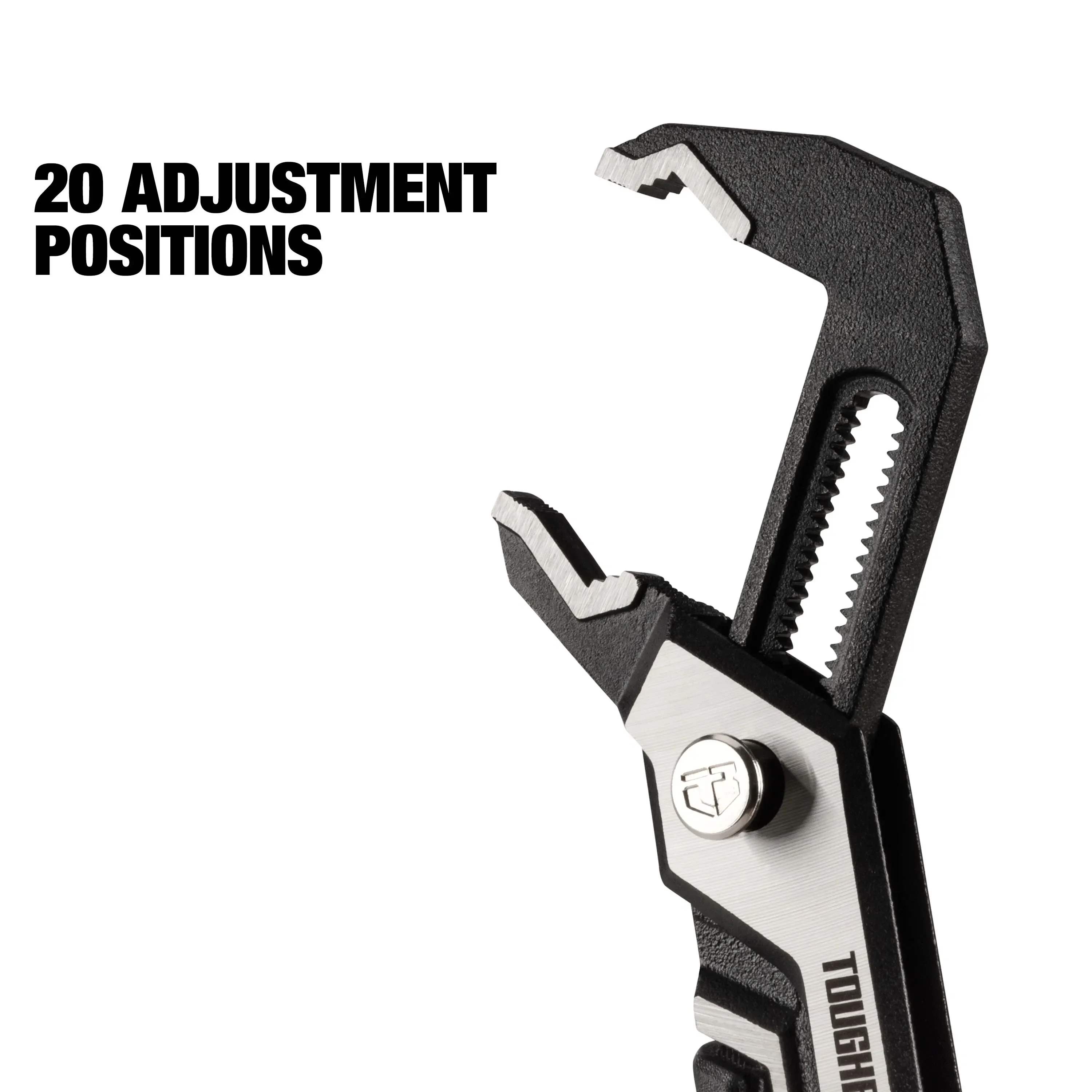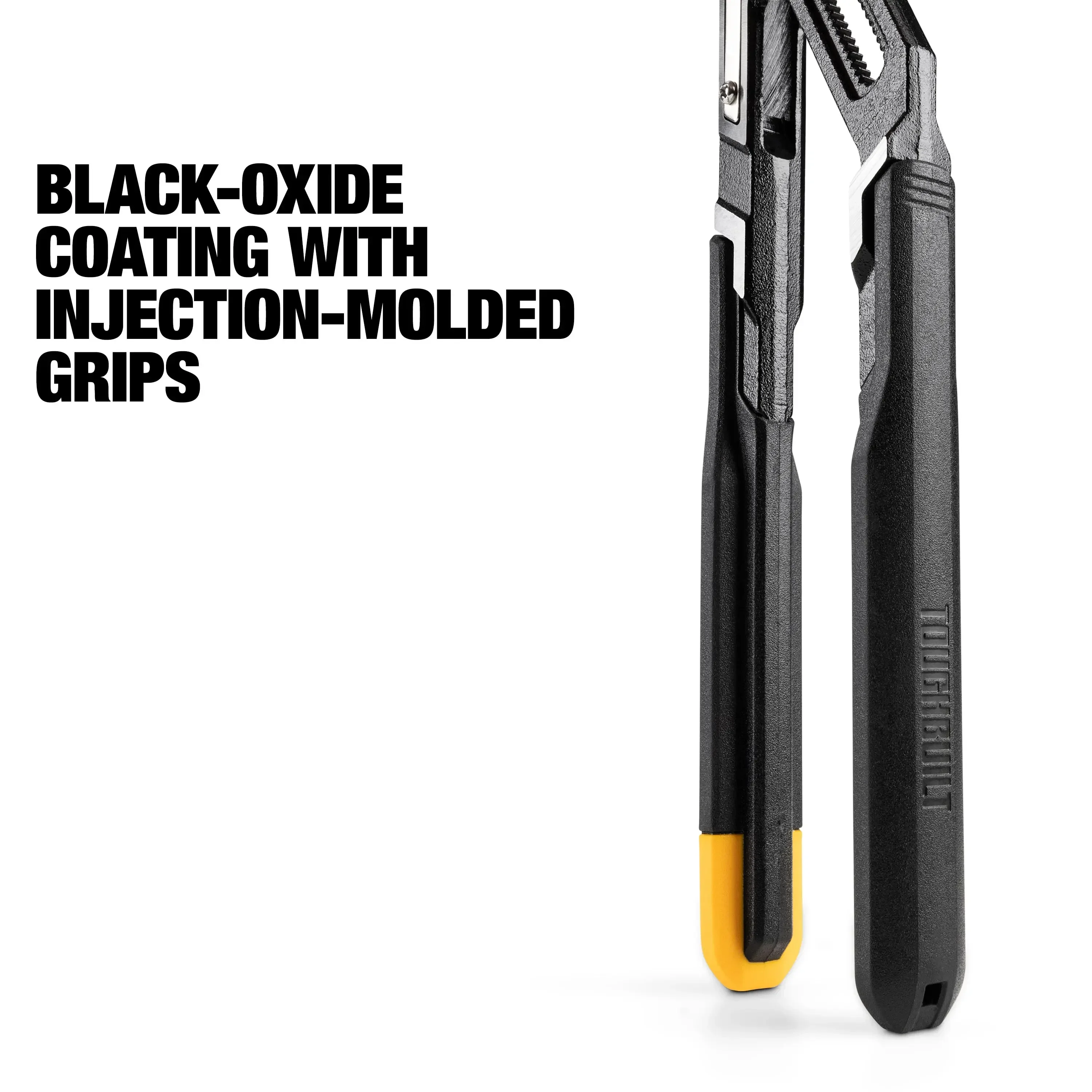 The ToughBuilt 12" SpeedSet V-jaw pliers quickly adjust on the workpiece which makes it easier to work in confined spaces. SpeedSet push button allows the lower jaw to slide smoothly and widen up to 2-1/8". The 22 micro-adjustments ensure the pliers can firmly grip fasteners and pipes of different sizes. Wide ergonomic grips are designed for all-day comfort when maximum force is being applied. To adjust the pliers opening, press the button, place the jaws around the workpiece, and slide the lower jaw closed.