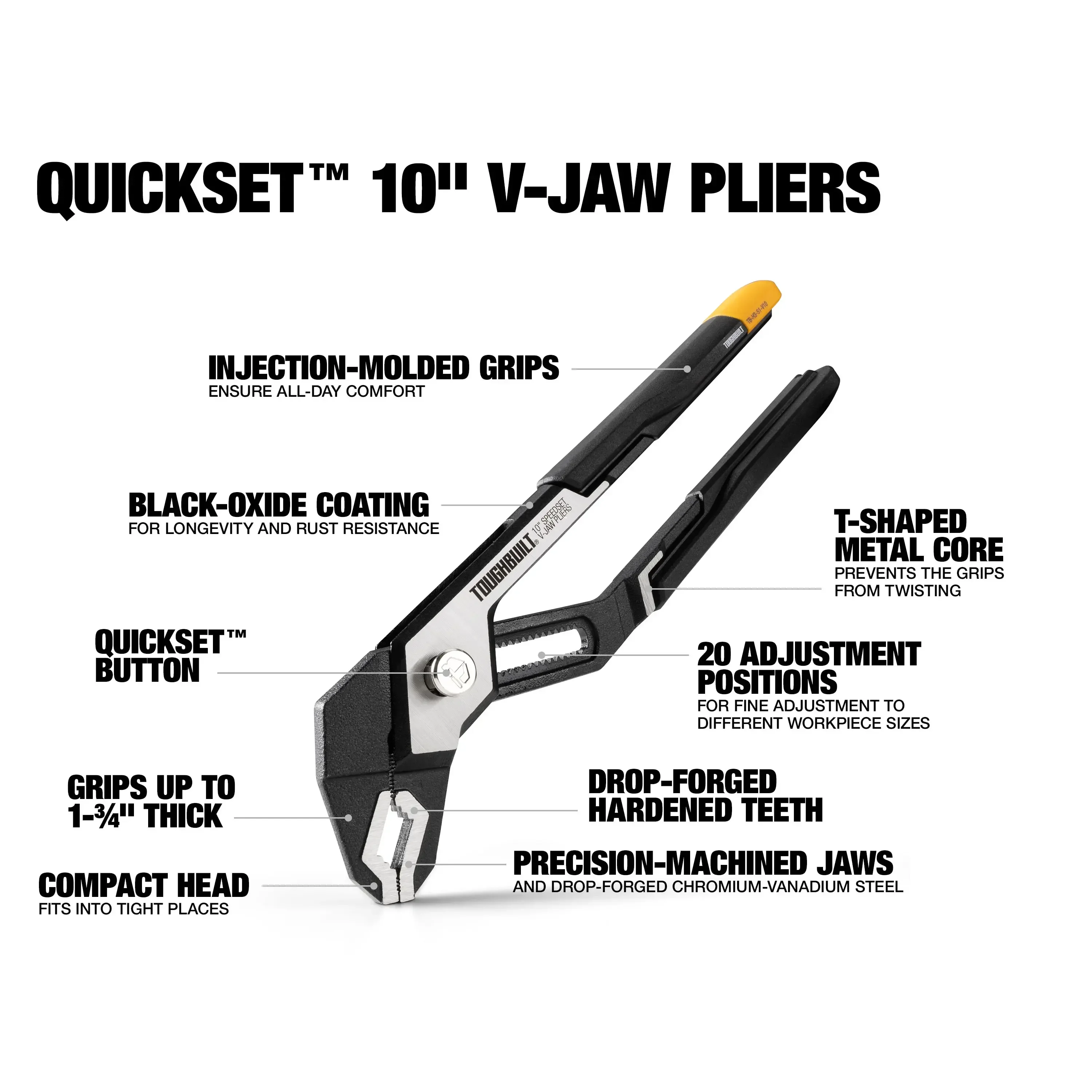 The ToughBuilt 10" SpeedSet V-jaw pliers quickly adjust on the workpiece which makes it easier to work in confined spaces. The SpeedSet push button allows the lower jaw to slide smoothly and widen up to 1-3/4". The 20 micro-adjustments ensure the pliers can firmly grip fasteners and pipes of different sizes. Wide ergonomic grips are designed for all-day comfort when maximum force is being applied. To adjust the pliers opening, press the button, place the jaws around the workpiece, and slide the lower jaw closed.